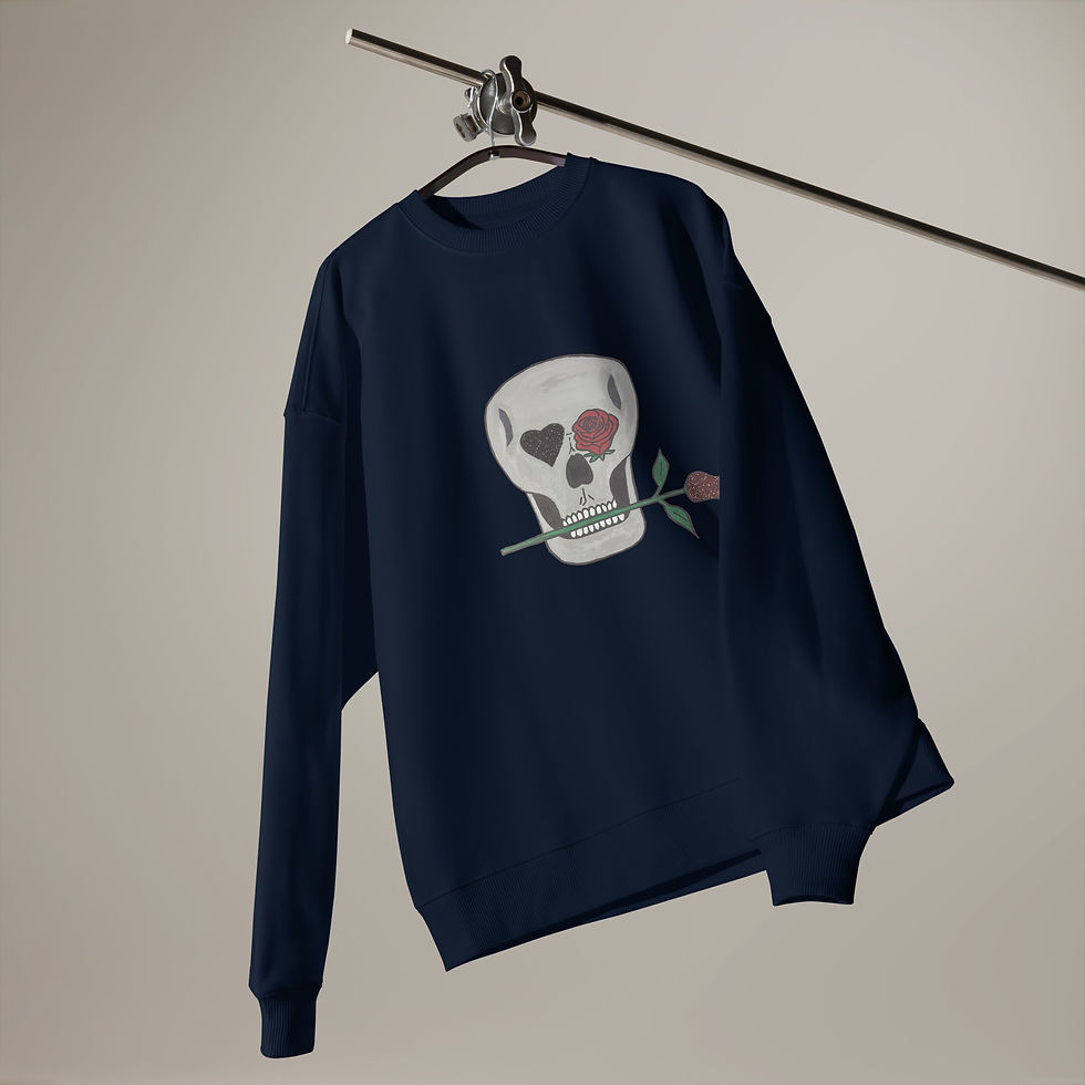 The skull bears a heart and a rose, reminders that even in our darkest hours, love and art remain.
